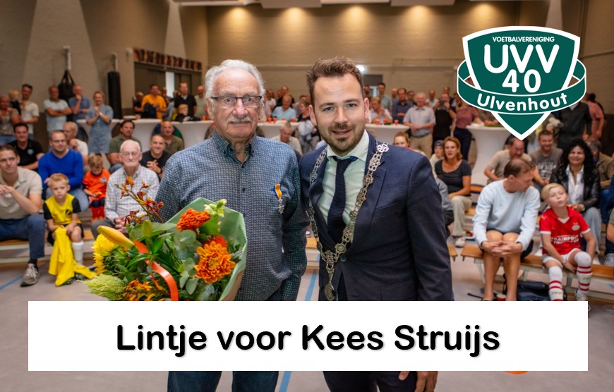 Trots kunnen we melden dat Kees Struijs afgelopen zaterdag tijdens onze opening van het voetbal seizoen gedecoreerd is en benoemd tot Lid in de Orde van Oranje Nassau. Wethouder Arjen van Drunen was speciaal voor 85 jaar UVV'40 én onze Kees naar Jeugdland gekomen. Dit vanwege zijn grote verdiensten voor onze familieclub met ambitie en dit al 51 jaar. Naast zijn directe famile was ook 'zijn kampioensteam' van 1977-1978' bijna volgtallig aanwezig.