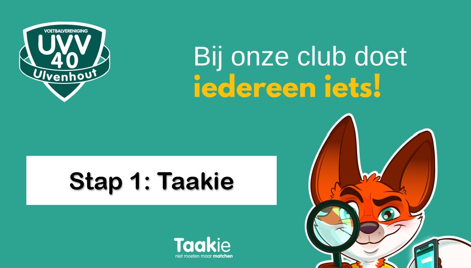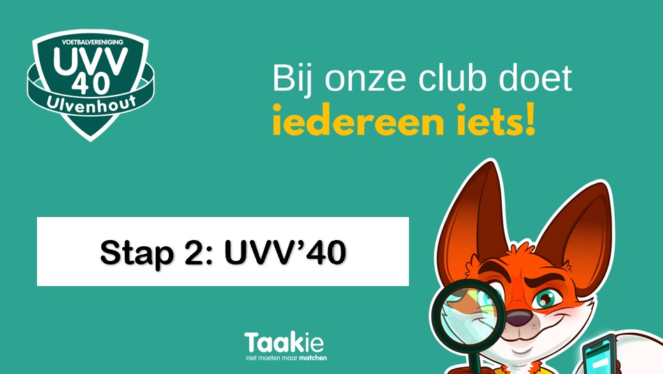 UVV'40 is een actieve vereniging in Ulvenhout, waar sportiviteit en gezelligheid als kernwaarden gelden. Met leden die het leuk en vanzelfsprekend vinden om de vereniging draaiend te houden door een vrijwillige bijdrage te leveren, om er samen voor te zorgen dat alle klussen en werkzaamheden gedaan worden. Geen enkele (amateur)sportvereniging kan bestaan zonder de inzet van vrijwilligers. Zonder vrijwilligers geen vereniging en zonder vereniging geen voetbal. En daarom vragen we eerst je eerst om een aantal vragen over vrijwilligerswerk in te vullen. Daar gebruiken we Taakie voor.