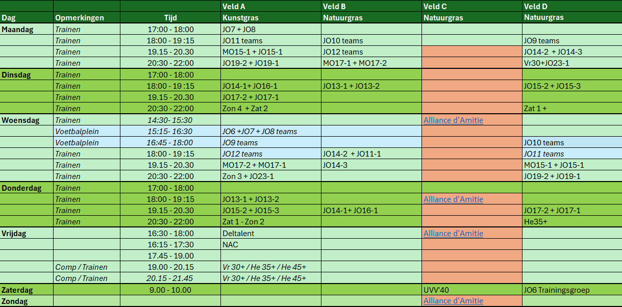 Voor de periode van 19 januari tot en met 28 maart is het nieuwe trainingsschema van UVV'40 vastgesteld. In dit schema zijn alle trainingstijden en -dagen per team overzichtelijk weergegeven. Het schema is van toepassing tot het einde van maart en geldt voor alle teams, tenzij anders gecommuniceerd door de technische staf.