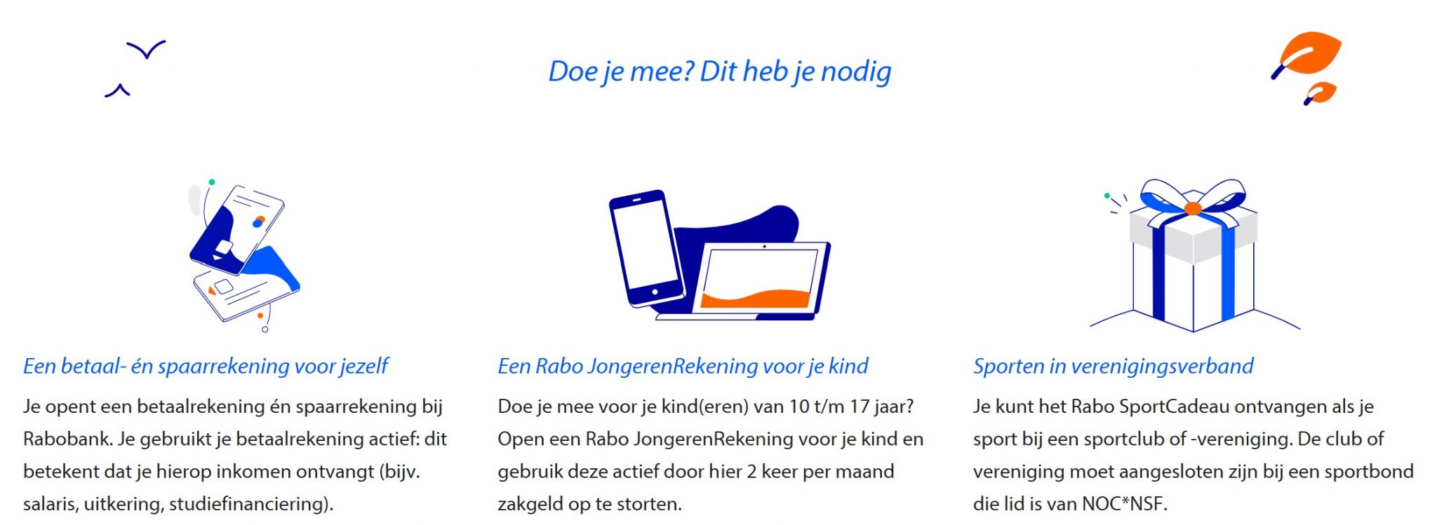 Aanvragen is heel eenvoudig! Door naar www.RaboBank.nl/particulieren/sportactie te gaan en in te loggen kun je heel gemakkelijk het SportCadeau aanvragen. Er zijn enkele voorwaarden aan de actie, waaronder dat je als ouder een lopende rekening hebt en voor de jonge sporter een jongeren rekening hebt of opent.